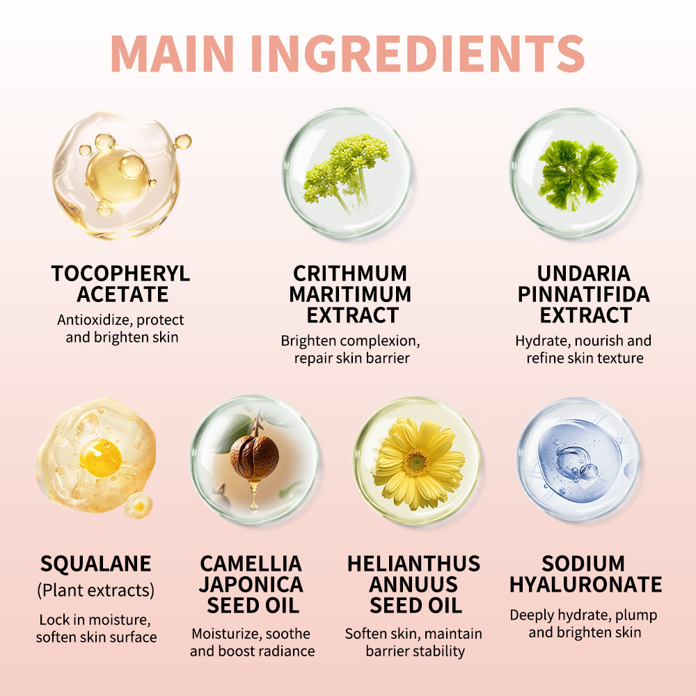 2、核心成分:包括透明质酸、植物角鲨烷(滋养保湿),还有海茴香提取物(类视黄醇功效,平滑肌肤无刺激)和裙带菜提取物(强化皮肤屏障)。
