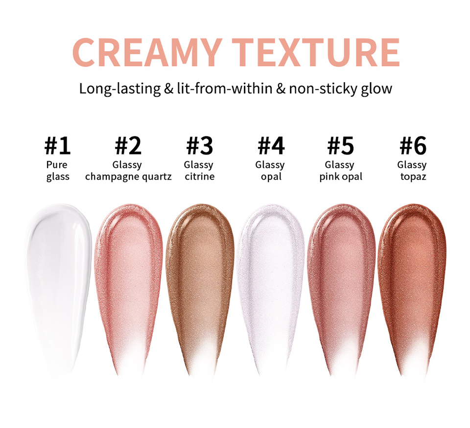 5、 6 款琉璃质感色号:清透款(Pure Glass 透明色)、暖调款(Glassy Champagne Quartz 香槟金、Glassy Citrine 黄金色)、冷调款(Glassy Opal 虹彩粉、Glassy Pink Opal 玫瑰金)、中性款(Glassy Topaz 金铜色)