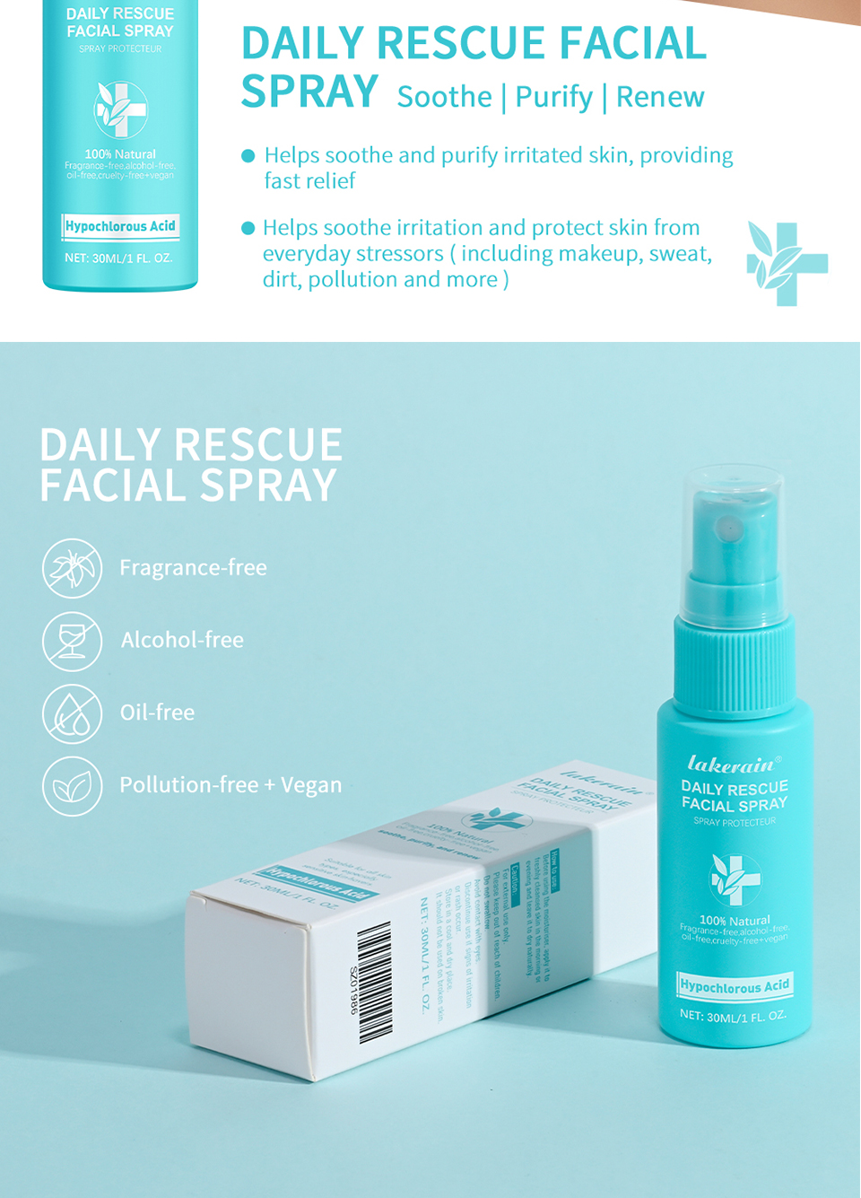 特点: 1.成分简单,只有三种成分,水、氯化钠和次氯酸; 2.有助于舒缓和净化肌肤,快速缓解愤怒的肌肤; 次氯酸,帮助镇静肌肤,保护皮肤屏障,防止皮肤过敏;有助于减轻红肿和刺激。