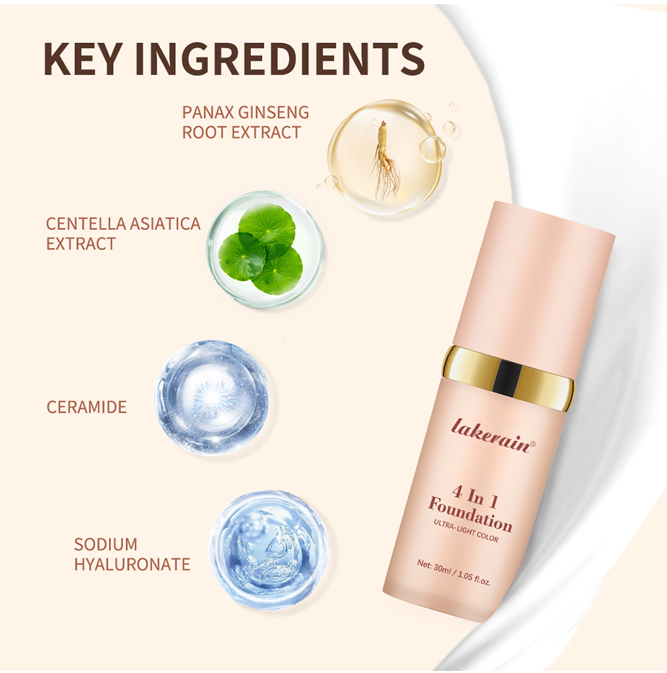 特点: 1、4合1多功能粉底液:集粉底液、遮瑕膏、保湿霜、SPF30防晒霜于一身 2、防水防汗,轻薄服帖、清爽不粘腻、滋润保湿不卡粉 3、白色的乳霜质地,抹开后渐渐变为粉底液的肤色,与肌肤完美贴合 4、含多种保湿护肤成分:人参提取物、积雪草、神经酰胺、透明质酸