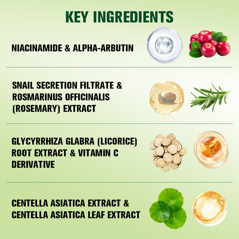 产品特点: 1.成分高效:含烟酰胺、蜗牛黏液等 8 大活性成分,协同实现提亮淡斑、保湿修复、抗皱紧致、舒缓维稳; 2.1 片多用(可当爽肤水 / 局部面膜),适配所有肤质(敏感肌、孕妇友好); 3.温和安全:无酒精、香精等有害添加,无动物实验
