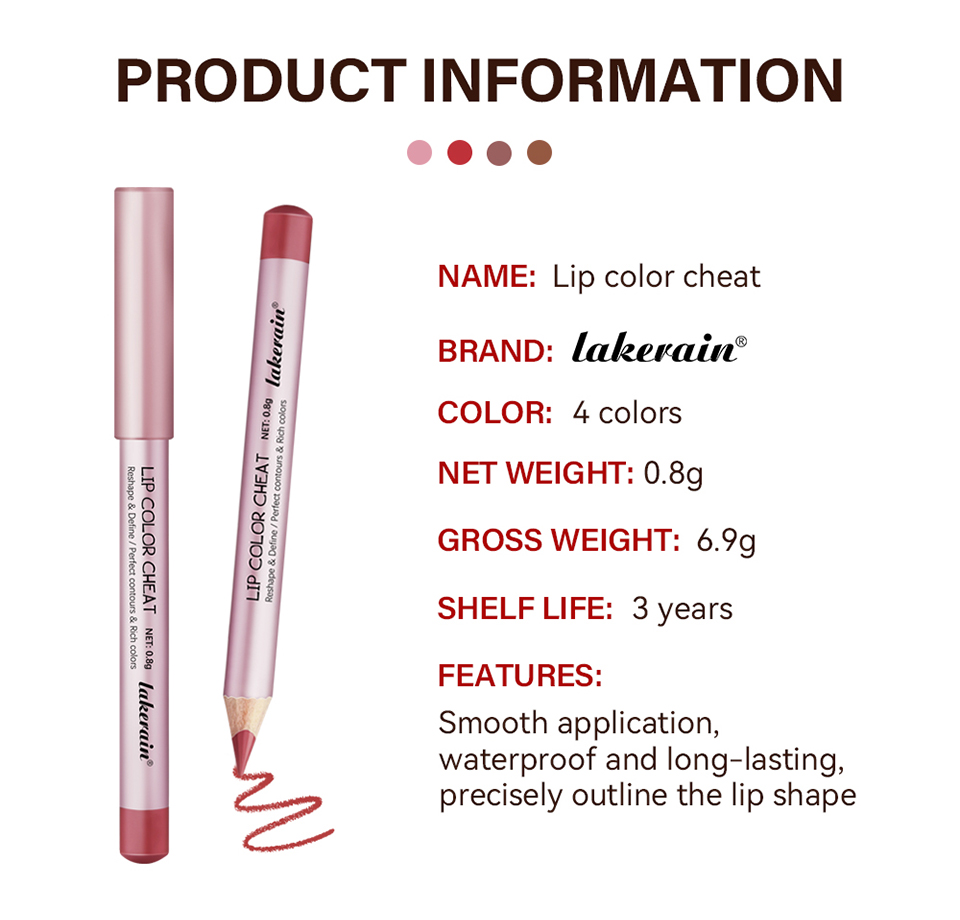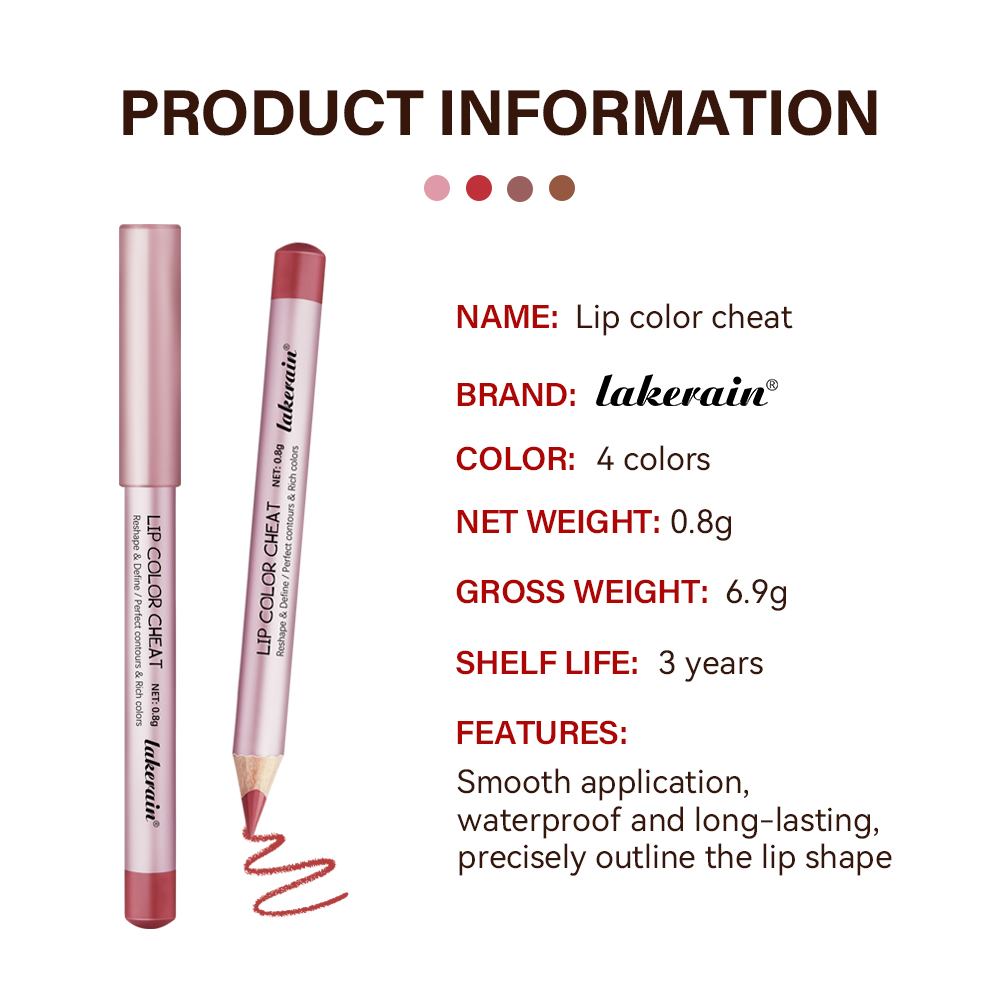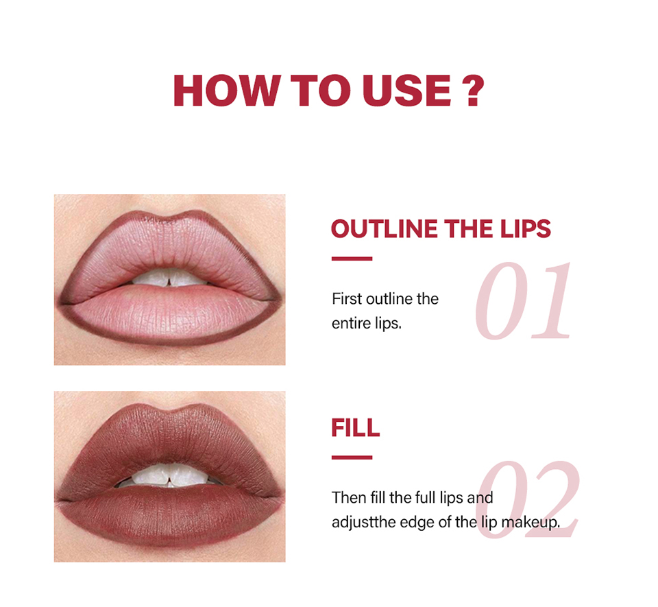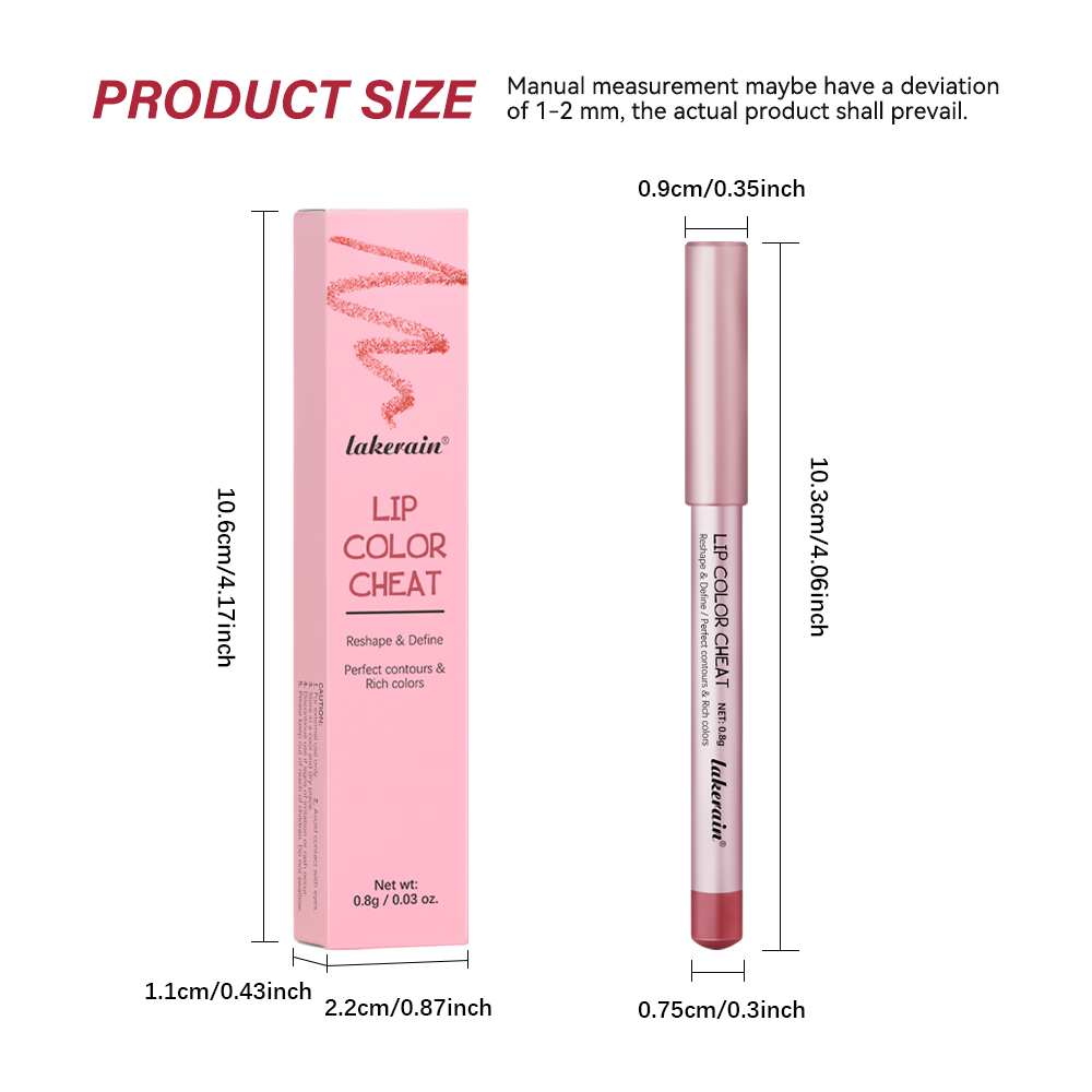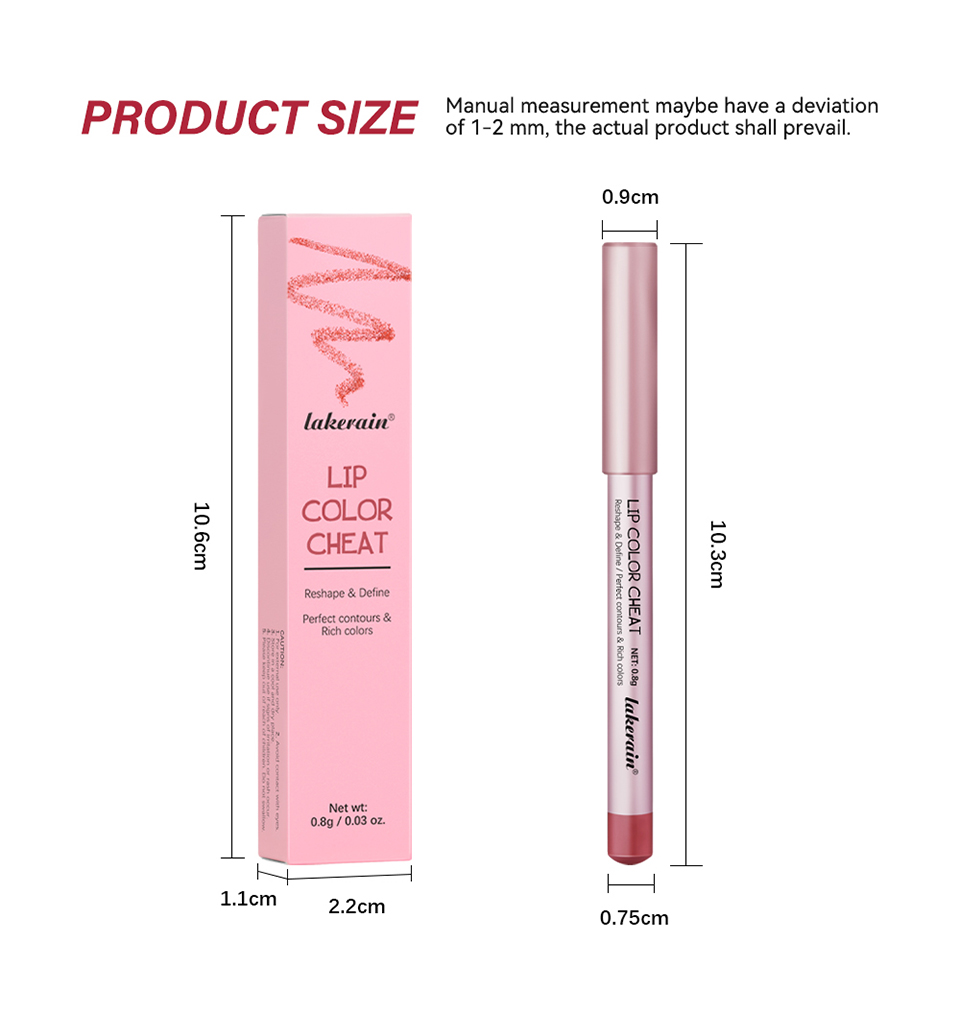 特点: 1、迷你尺寸,方便携带,适合外出旅行适用。 2、质地滋润顺滑,妆效轻盈舒适,能很好的贴合唇部肌肤。 3、精准勾勒唇形,打造出性感唇形,满足对精致妆容的需求。 持久度高,具有长效持妆的效果,不用频繁补妆,能长久保持妆容完整性