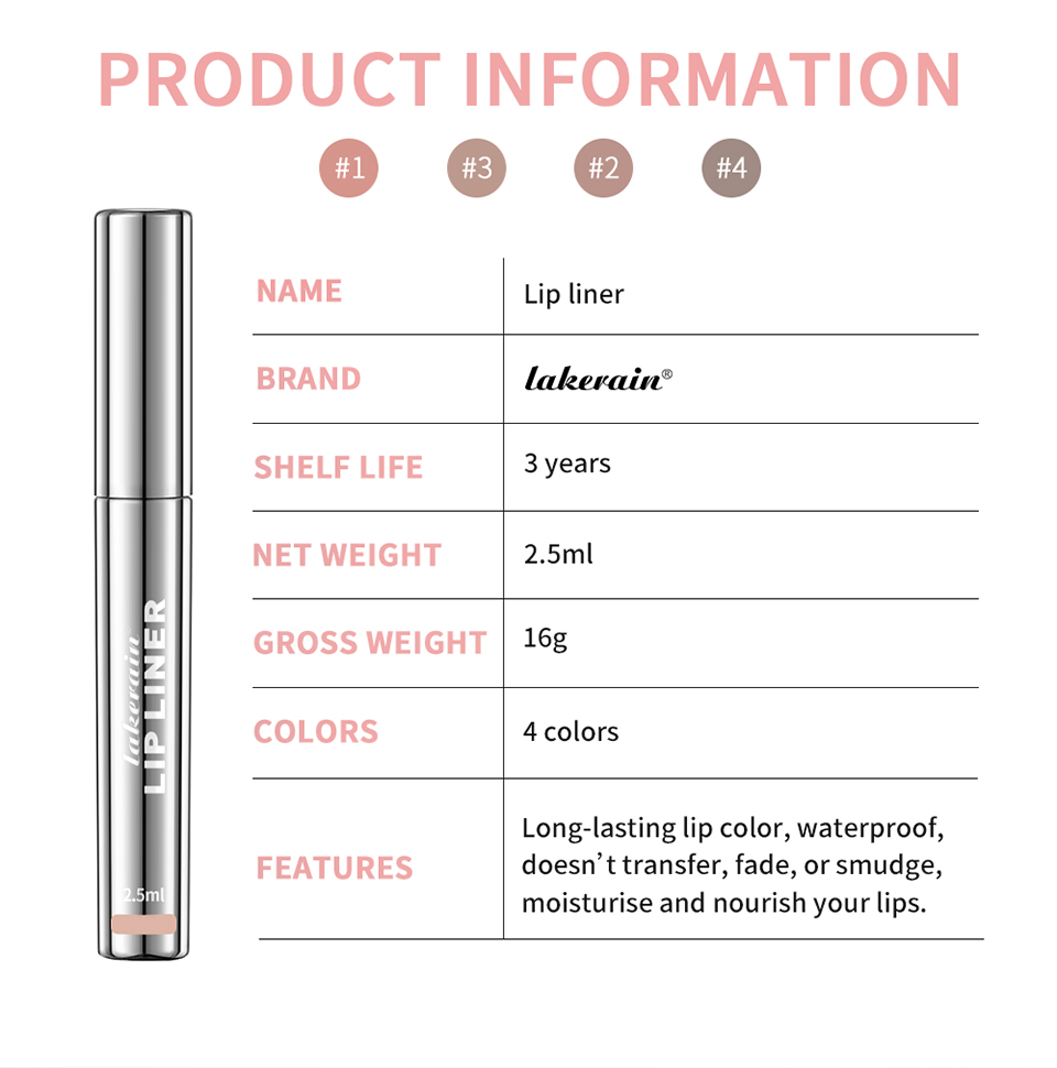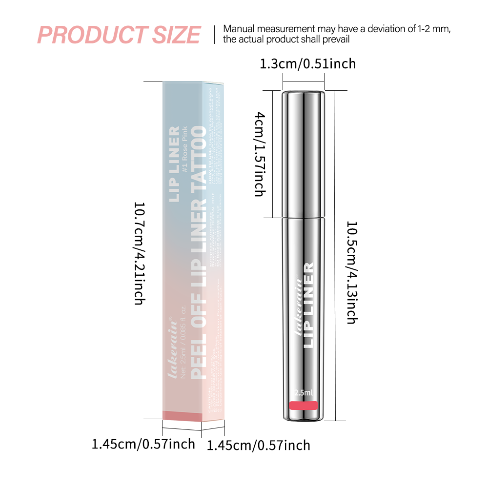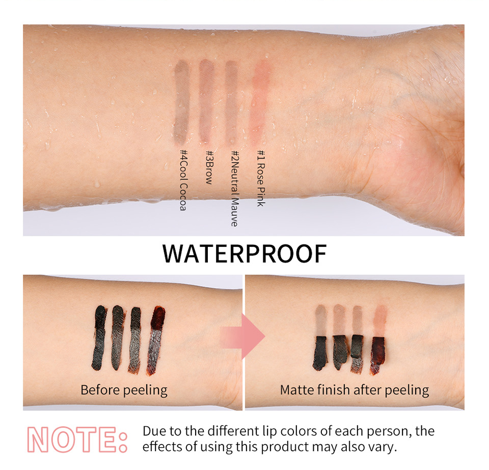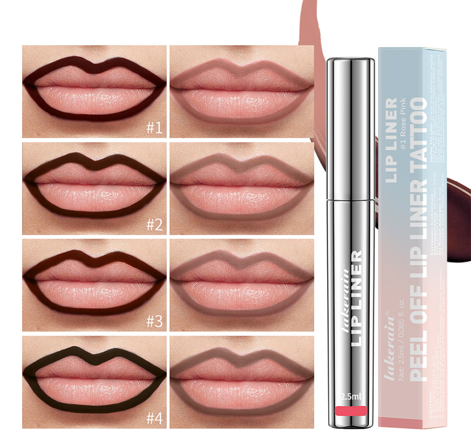 特点: 1.这款可剥离的唇线笔可为唇部提供持久唇色; 2.具有防水,不转移、不褪色、不晕染的特点; 3.成分中含有透明质酸和维生素E,可滋润双唇; 4.有4种色号可供选,适合不同肤质和肤色的人使用; 5.最终剥离的颜色呈现出哑光效果。