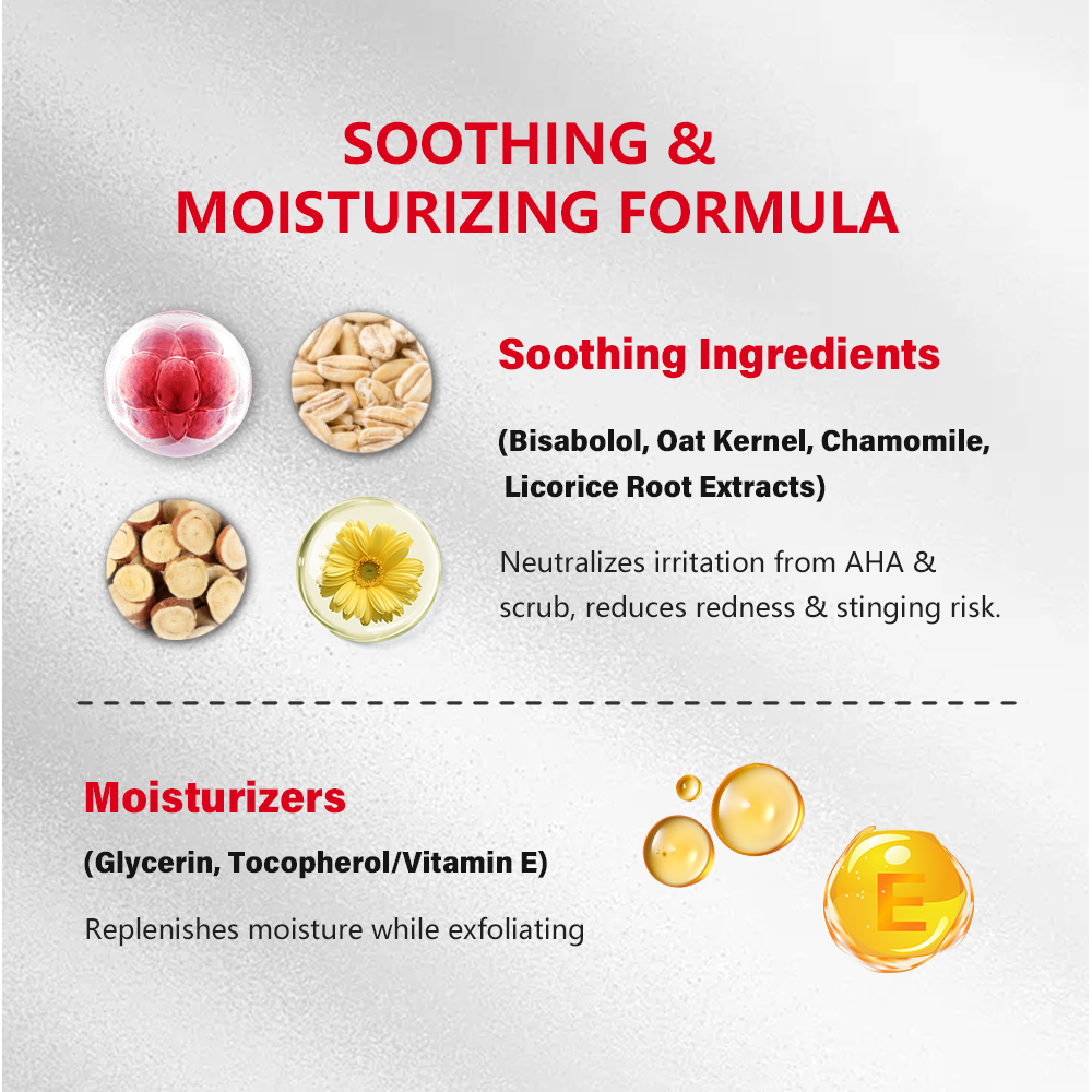 2、搭配舒缓修护+保湿配方:红没药醇、燕麦仁、母菊提取物、甘草根提取物等舒缓成分,中和 AHA 与磨砂的刺激性,减少肌肤泛红、刺痛风险,添加甘油、生育酚(维生素 E)等保湿成分,在去角质的同时补充肌肤水分