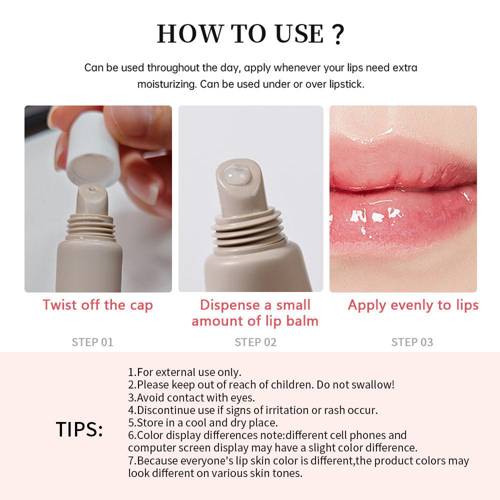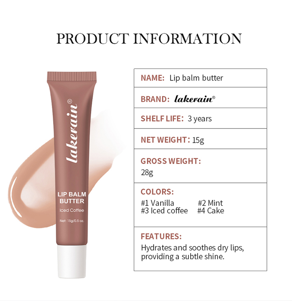1、质地顺滑,不油腻,易于涂抹使用; 2、含有乳木果油、油橄榄果油、纯植物蜡和维生素E,能滋润唇部,为唇部提供抗氧化保护,有轻微的亮泽; 3、软管瓶身,瓶口是斜口设计,方便取样; 4、有四种色号和四种味道(#1 香草味、#2 薄荷味、#3 咖啡味 #4 甜味)可供选择