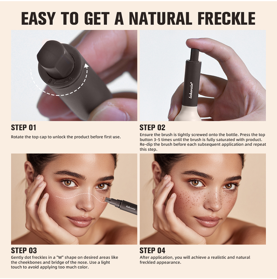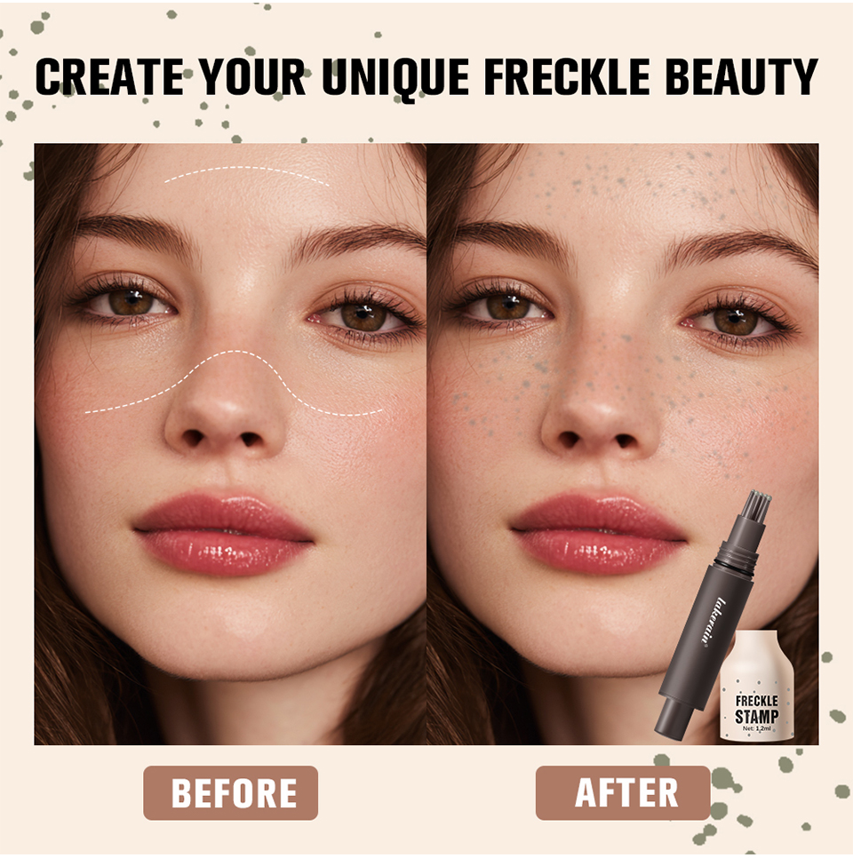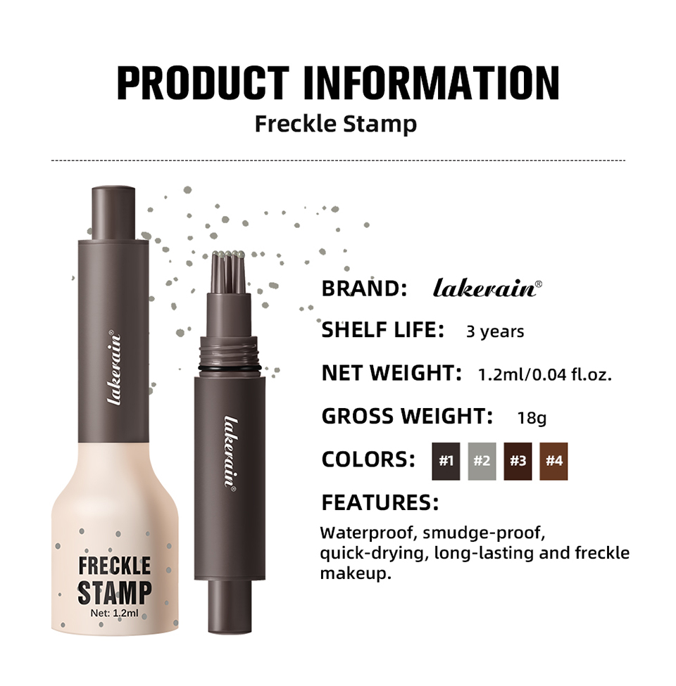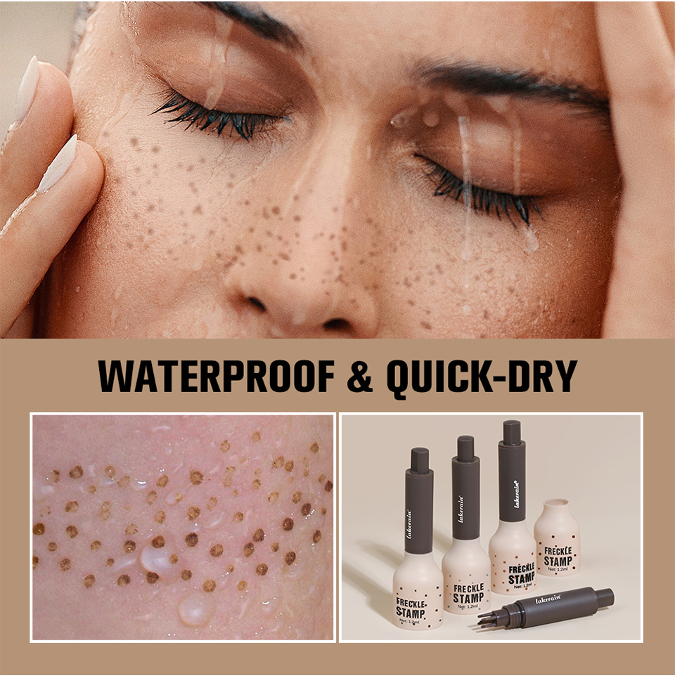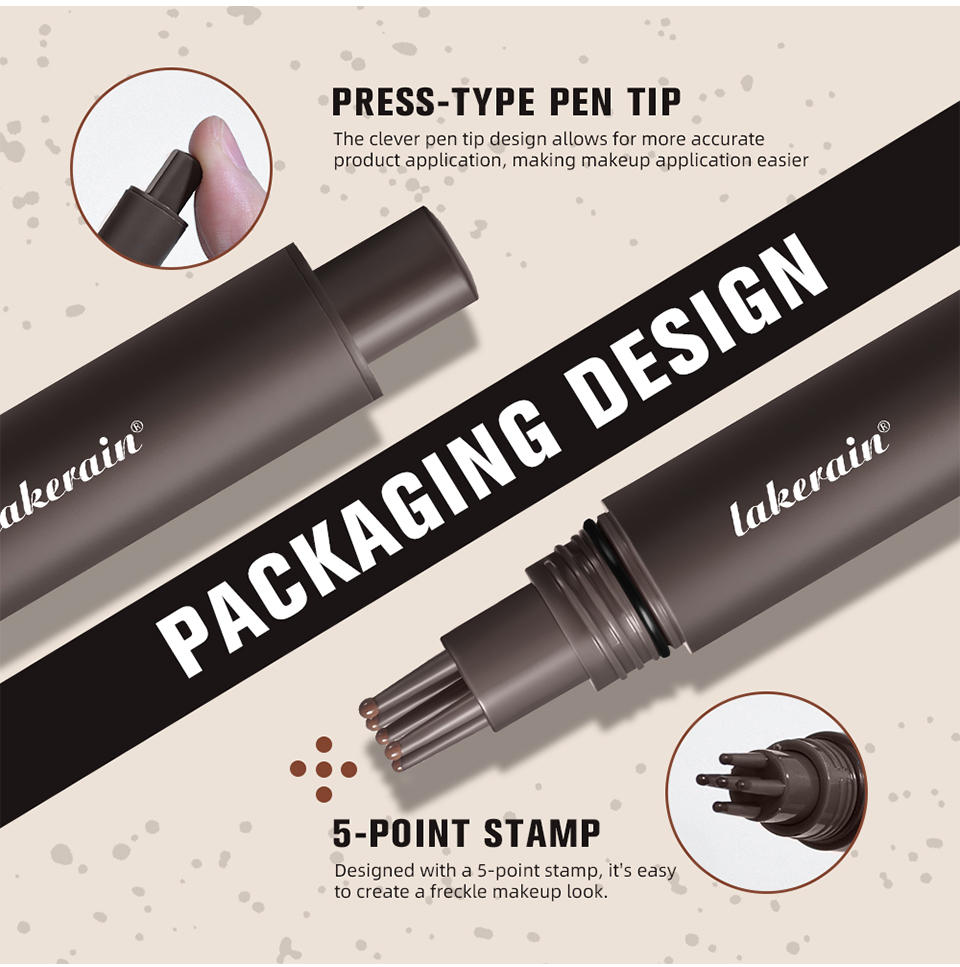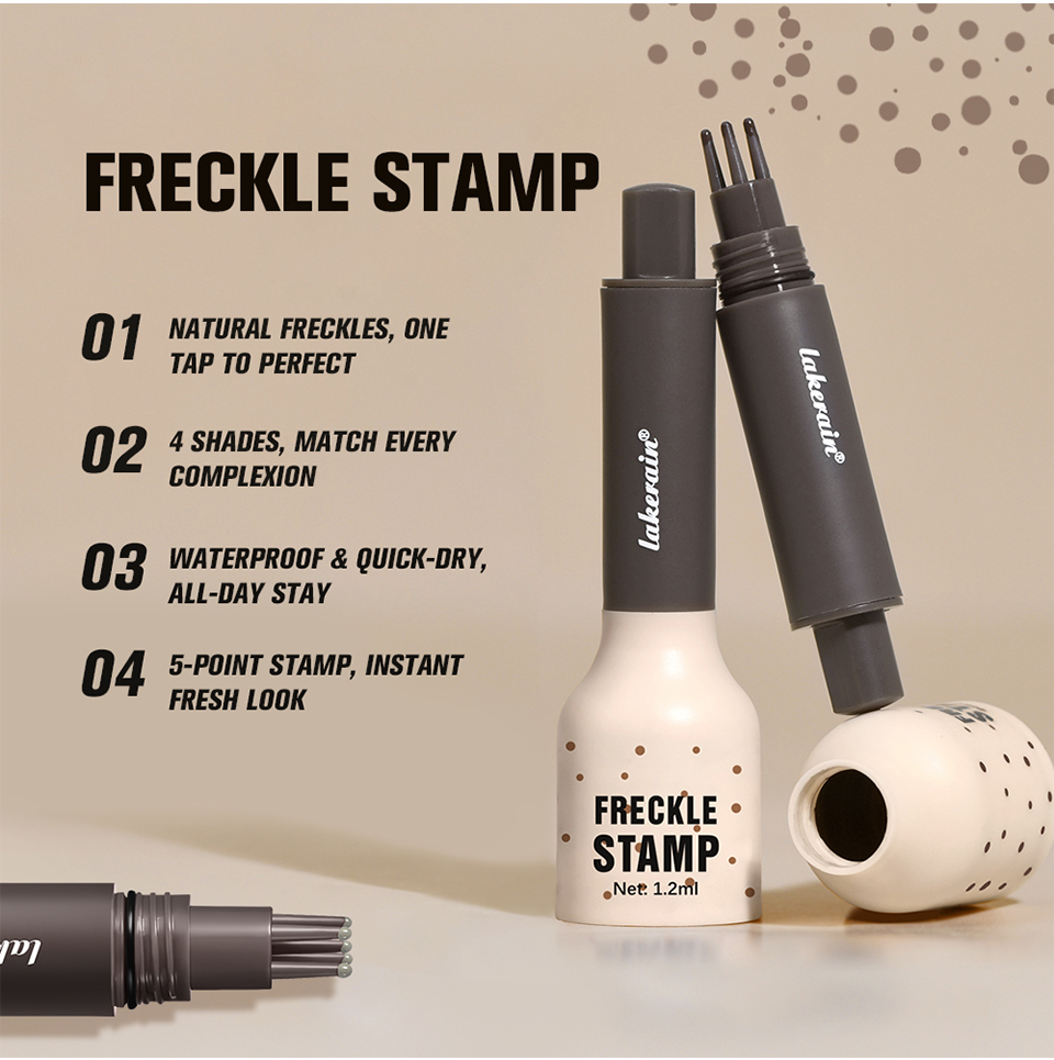 特点: 1.采用 5 点式印章设计,打造出自然逼真的雀斑效果。与单头雀斑笔相比,它能更快地在脸上打造出自然逼真的雀斑效果。巧妙的笔头设计让上妆更轻松。 2.它由高品质亲肤成分制成,不含刺激性化学物质,适合所有肤质。 3.速干雀斑技术确保你的雀斑妆容防水、防晕染,全天持久。这款雀斑印章耐用性强,即便接触汗水或少量水分也能保持完好。