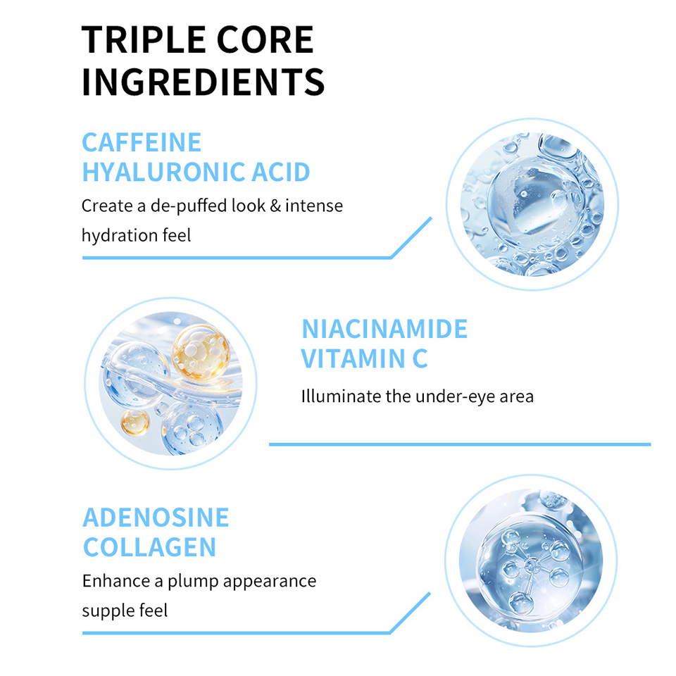 2.针对性解决三大眼周困扰:含咖啡因减轻眼肿、烟酰胺与维 C 淡化黑眼圈、透明质酸与胶原蛋白充盈眼周并改善松弛;